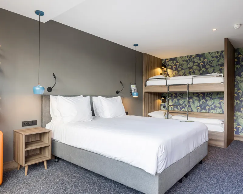 Das geräumige Familienzimmer im Van der Valk Hotel Eindhoven bietet einen schönen Blick auf den Genneper Park und ist sehr gut für Familien mit Kindern geeignet. Das Zimmer verfügt über ein King-Size-Bett (mit einer Matratze für 2 Personen) und ein Etagenbett für 2 Kinder. Das Badezimmer ist mit einer Toilette, einer Dusche, einem Haartrockner und verschiedenen Toilettenartikeln ausgestattet. Darüber hinaus verfügt das Familienzimmer über einen Esstisch mit 4 Stühlen, einen Flachbildfernseher und eine Klimaanlage. Sie können hier mit bis zu 4 Personen übernachten.