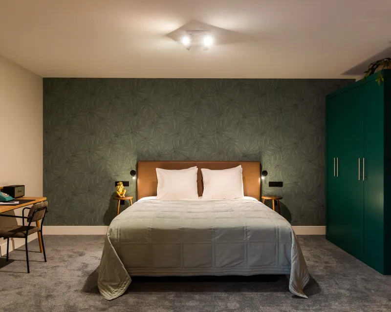 The suite also boasts a separate living room area which is equipped with a smart TV (with streaming possibilities for Netflix), comfortable couch and armchairs. Furthermore, the Jungle Family Suite is equipped with a Smeg minibar, Bluetooth record player, air conditioning and a spacious balcony with lounge area. Moreover, the suite has a separate sleeping area for the children, which is equipped with two bunk beds, making the Jungle Family Suite very suitable for families. Because the sleeping area for the children is shielded from the rest of the suite, the Jungle Family Suite is also very suitable for a long business stay in our hotel.