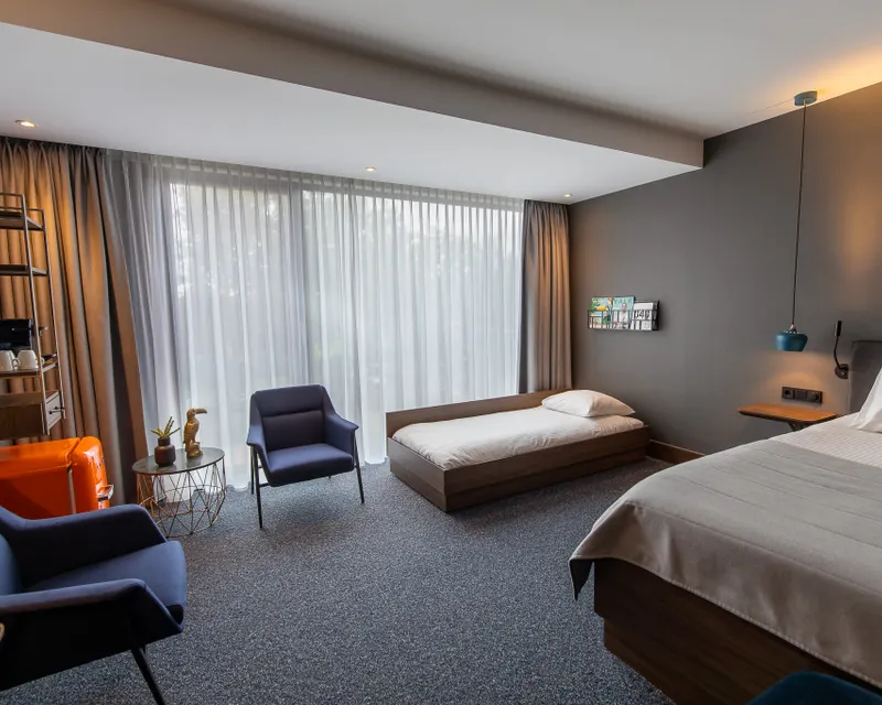 Discover the completely renovated Superior Triple Room of Van der Valk Hotel Eindhoven. This modern room offers all the luxury you could wish for. The Superior Triple Room is equipped with a flat screen TV, Bluetooth radio, kettle, Smeg minibar, ironing facilities and air conditioning. The room also boasts a king size bed with high-quality mattresses which facilitate a good night’s sleep. Additionally, a 3rd (pull-out) bed is available, making the room suitable for 3 persons. The comfortable desk also makes the room highly suitable for working. Furthermore, the luxurious open bathroom is equipped with a rain shower, hairdryer and various care products. A separate toilet is also available in some of the rooms.